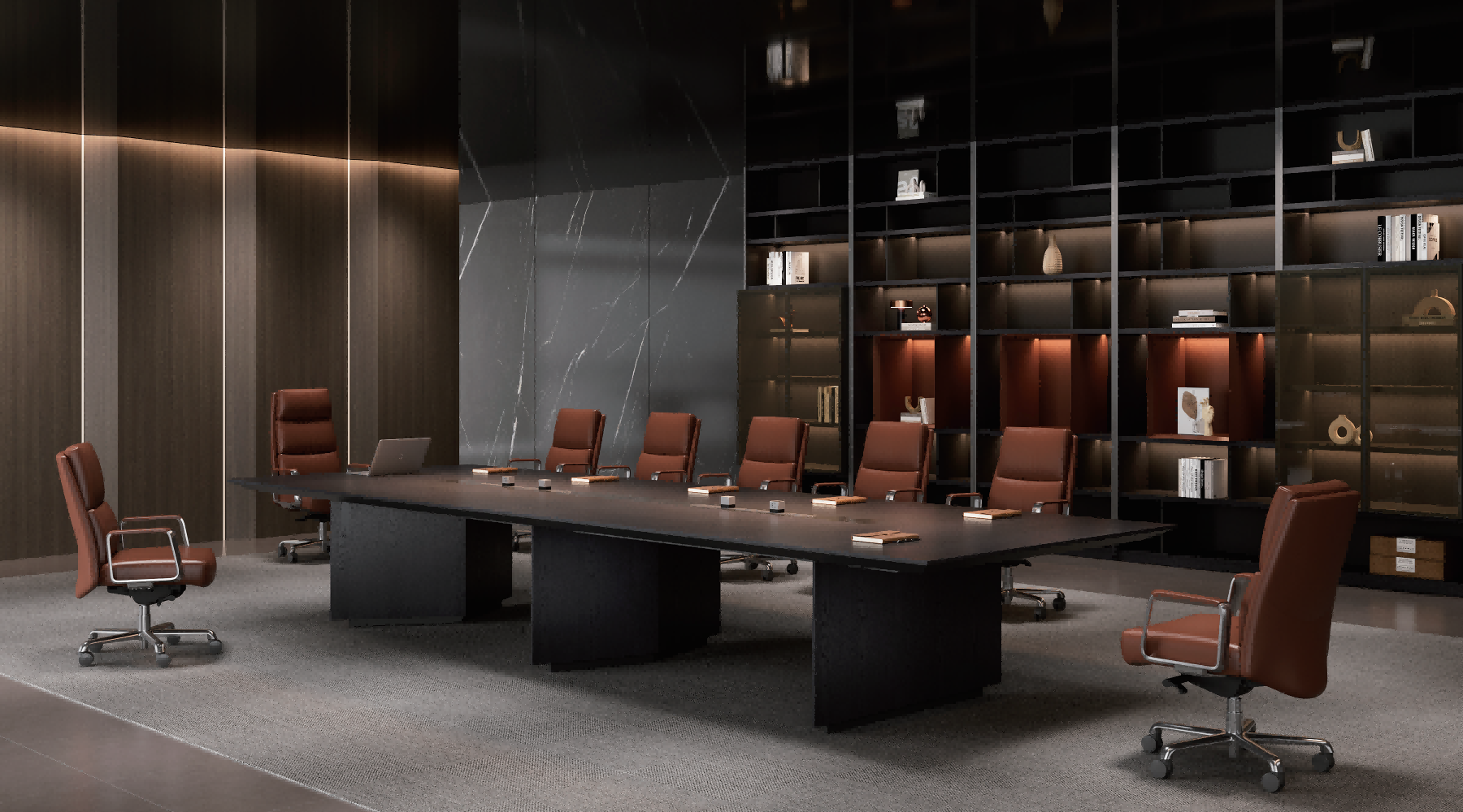Product highlights: Conference tables (various sizes), conference chairs, and presentation credenzas.
