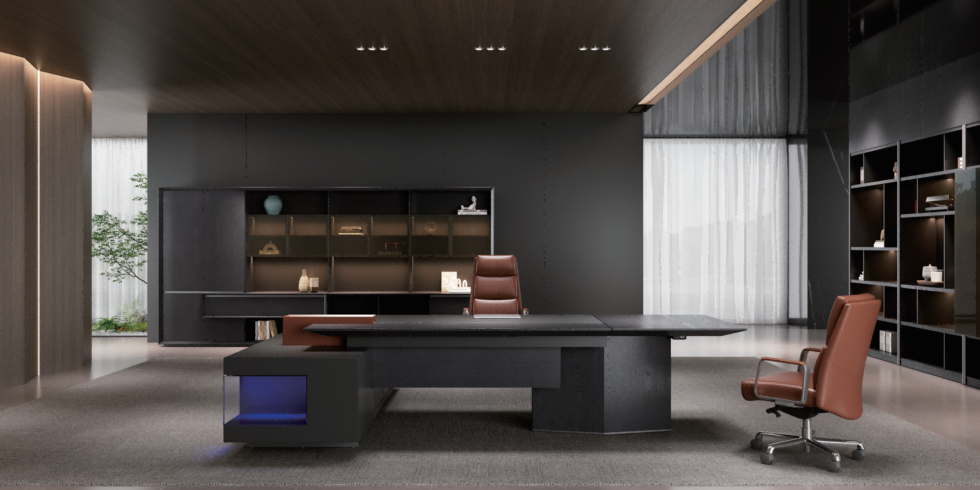 Product highlights: Executive desks, executive leather chairs, side cabinets, and bookshelves.