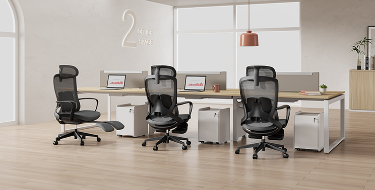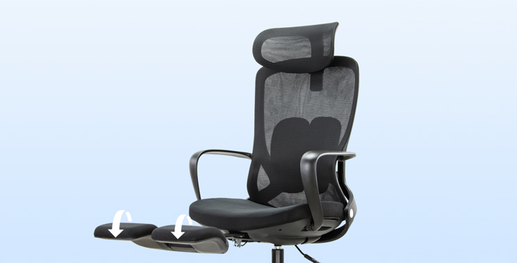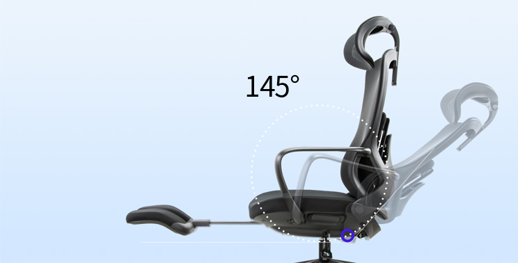 The chair back reclines up to 145°, featuring three recline lock positions with a footrest for comfortable midday breaks. Armrests move synchronously during recline, allowing seamless switching between upright sitting and reclining.