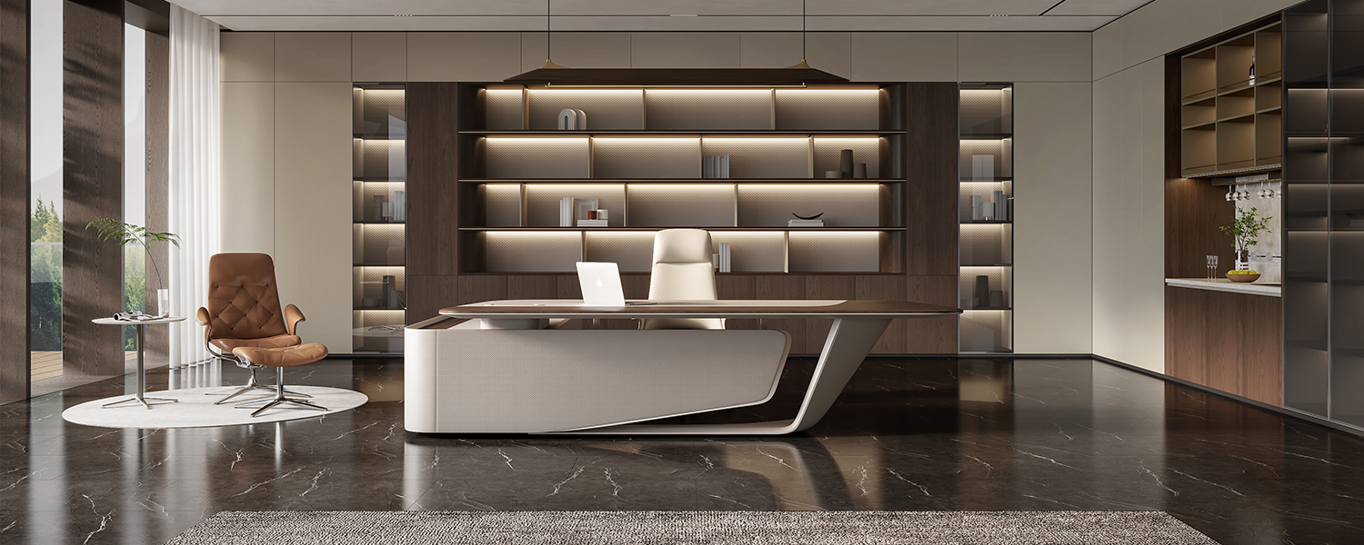 A holistic perspective and profound depth of thought, extending from the particular to the universal. The “Command Series” breaks free from the conventional rectilinear norms of traditional executive desks, employing fluid lines and innovative geometric forms. Within its minimalist design lies boundless dynamism, mirroring the composed demeanor of a leader orchestrating grand strategies. It comprehensively showcases your exceptional vision and vitality.