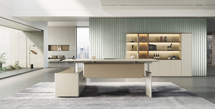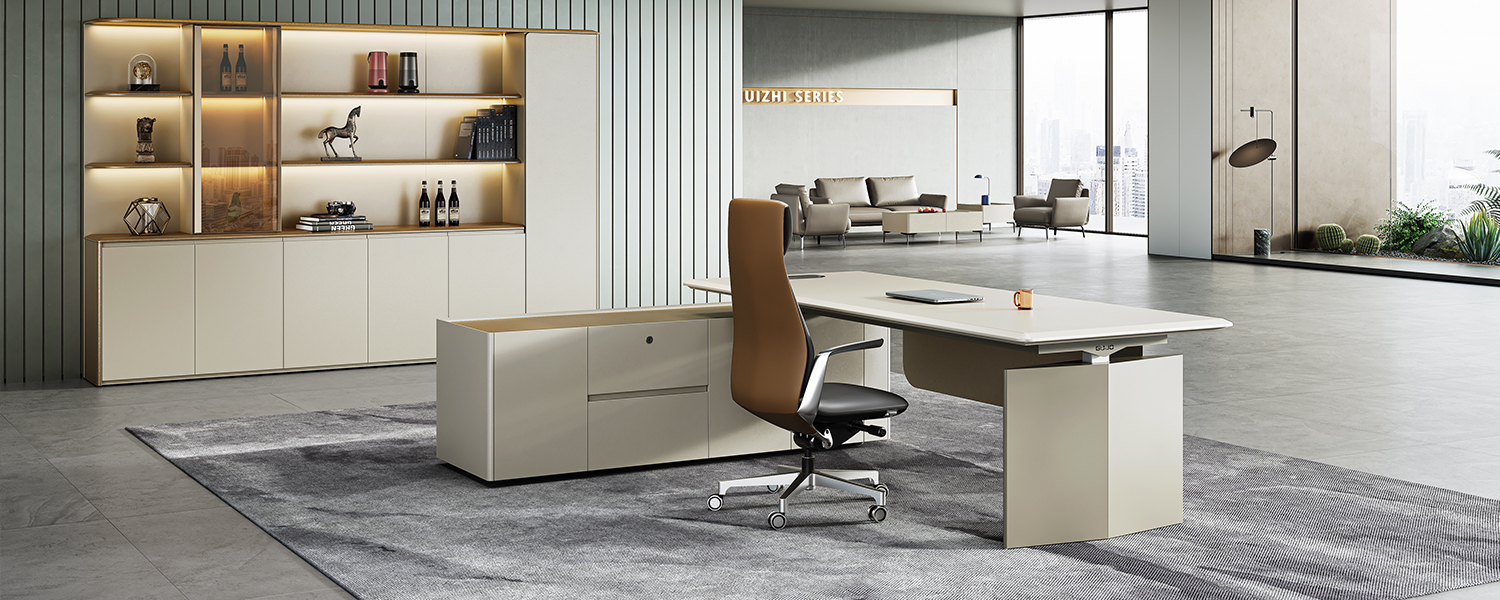 The adjustable-height desktop features an intelligent lifting system, integrating health-conscious design principles into the office environment. The desk legs boast rounded corners at both ends for a distinctive aesthetic. The attached cabinet incorporates flush-mounted doors, drawers, and door panels with a handle-free recessed pull groove design for a clean, minimalist look. The top drawer of the attached cabinet is equipped with a fingerprint lock.