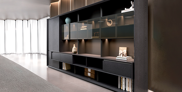 The filing cabinet combines practical storage and display functions with a distinctive modern business aesthetic. Through clever lighting arrangements, it creates striking light-dark contrasts that significantly enhance spatial depth, elevating the quality and sophistication of the office environment in every way.