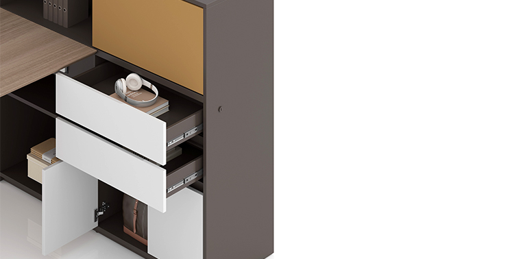 Two drawers + two hinged doors + one sliding door, organized by category and tier for neat and orderly storage, with a dedicated space reserved for the main unit. The cabinet combines document storage with integrated cable management, featuring pre-designed internal routing channels and reserved outlets and junction boxes for installing sockets and routing cables, accommodating the use of various electronic devices.