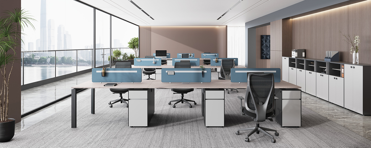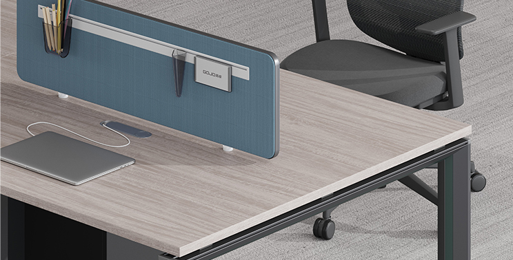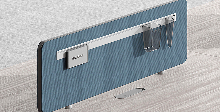 The desk screen panel features a smooth fabric-textured surface finish. Aluminum alloy edging is inserted into the grooves around the panel's perimeter. The hanging slot offers a sleek, minimalist design while providing functionality for suspending items, maximizing office space efficiency. The panel's base incorporates a screen base that facilitates easy connection and contributes to the overall aesthetic of the desk screen.