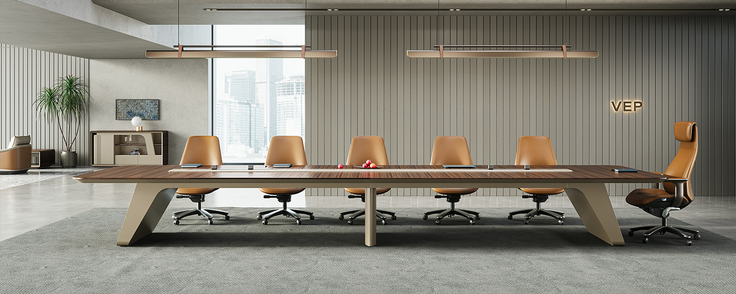 The conference table continues the series' signature gradient inward-curved edge design, embodying luxury and refinement within minimalist aesthetics. It transcends the limitations of traditional straight-line forms, delivering a visually striking impact. The overall use of curved elements creates a simple yet elegant aesthetic experience.
