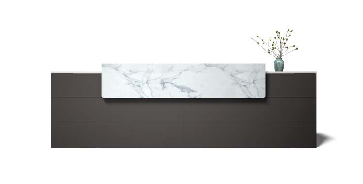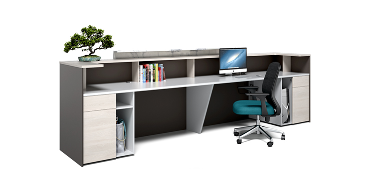 The front panel and side panels are connected using a 45-degree laminated joint; decorative panels are joined with laminated joints. The entire structure employs a raised base design with support plates to enhance the layered appearance of the front desk.