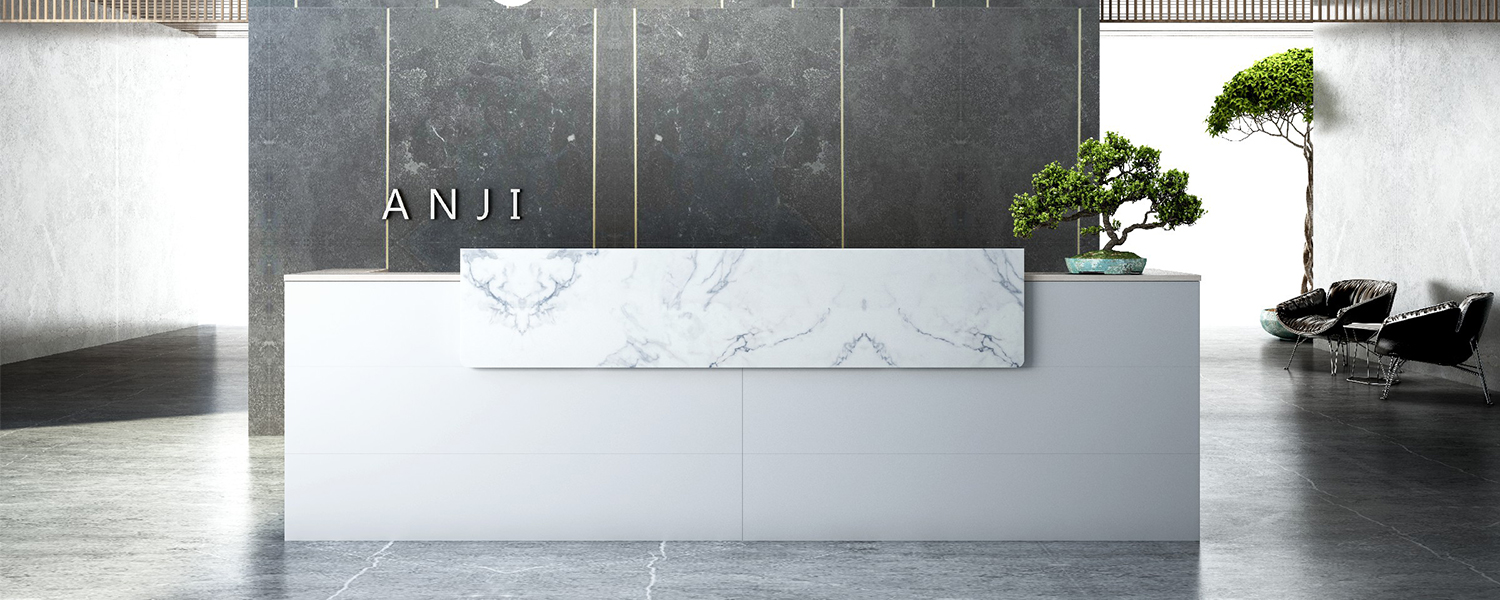 The reception area at Anji features a subtle, natural light-toned cloud-patterned stone finish, paired with Wenge wood to establish a contemporary office aesthetic. The irregular design creates an unconventional sense of staggered depth, lending the product a distinctive charm.
