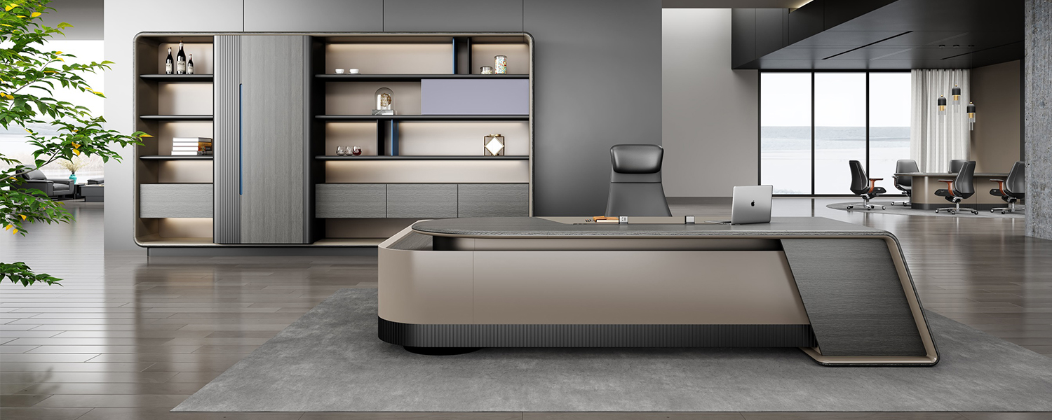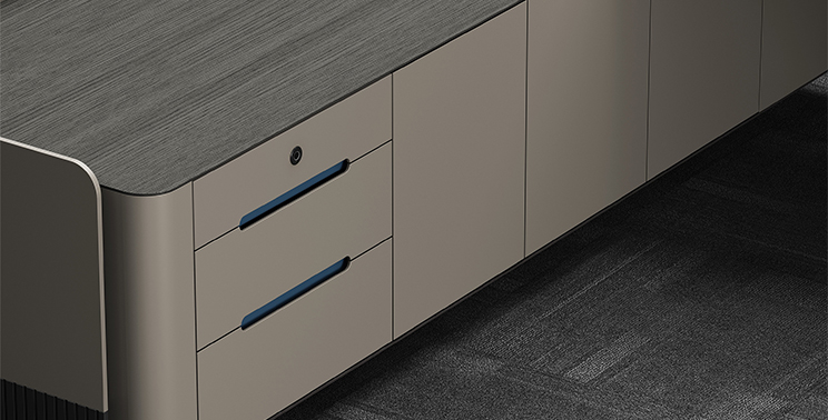 The primary color is Thai gray oak, complemented by coffee-gray lacquer. The grille design features exquisite, clear grain patterns with a strong sense of depth and modern sophistication, offering both layered aesthetics and practical functionality. The circular countertop seamlessly connects with curved side cabinets and panels, creating a soft, rounded silhouette. The design is clean and simple yet maintains an air of dignity.