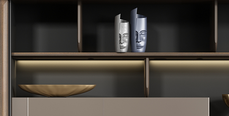 Large doors feature LED-equipped hanging rods. Downward-opening doors incorporate Blum lift-up hinges.