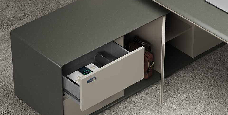 The base design employs the principle of leverage, using A-shaped legs as fulcrums to support the tabletop, creating a floating effect. The base's shape is formed through molded bending, making it difficult for competitors to replicate. The front panel utilizes premium cold-rolled steel, formed through three-dimensional bending, breaking away from previous flat designs to give the product a solid, stable, and sophisticated appearance.