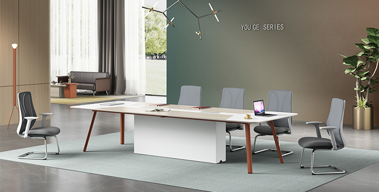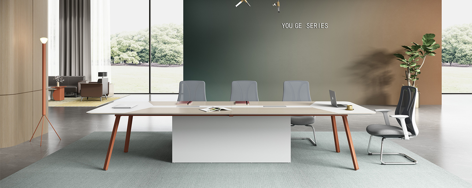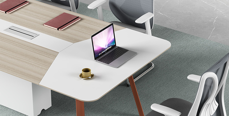 Assembled from double-layer panels, the countertop features a beveled edge at the base. The legs are equipped with height-adjustable functionality. The support cabinet corners are finished with sealed aluminum alloy trim, enhancing the product's refined and aesthetic appeal. Standard configuration includes brushed aluminum cable covers, with three pre-installed 86mm socket mounting holes inside.