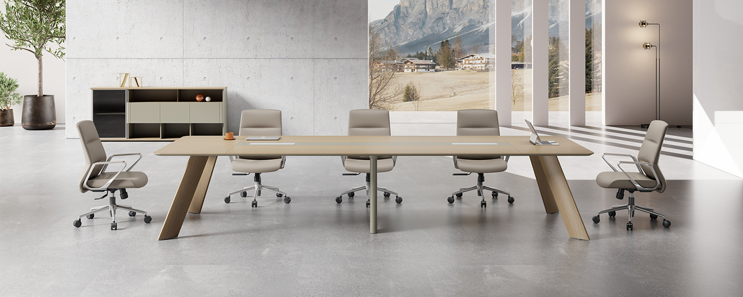Beveled edges finished with kraft paper; The ultimate fusion of wood grain and glass Bringing sophisticated and refined office solutions to the elite.