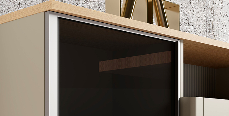 The tea cabinet continues the series design, interpreting modern aesthetics through minimalist materials and exquisite craftsmanship.DTC damping hinges. Aluminum-framed glass doors. DTC damping tracks.