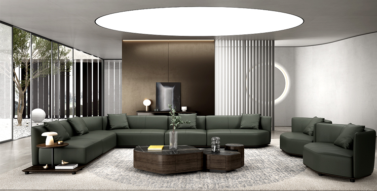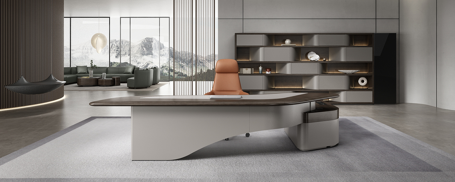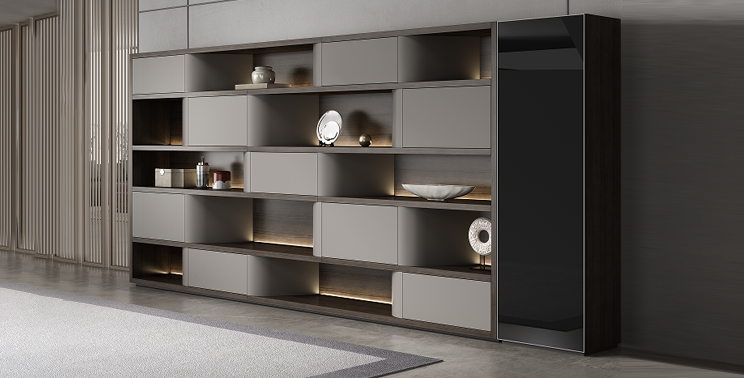 The back cabinet features an all-laminate design with drawers, lift-up doors, and drop-down doors. Its curved edges create a seamless transition throughout the cabinet. The interplay of dark wood grain and khaki tones lends the product a rich sense of depth. The wardrobe glass is made of lacquered glass, ensuring excellent privacy.