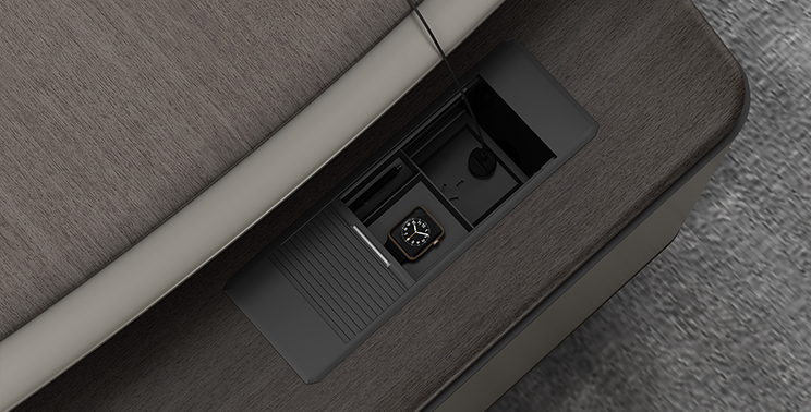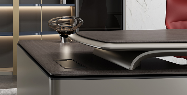 The upper of the side cabinet is equipped with push-pullintegrated wire box.The inspiration also comes from the storage space of the driver's seat. The sliding wire box cover makes the operation more convenient and gives the appearance of sense of science and times