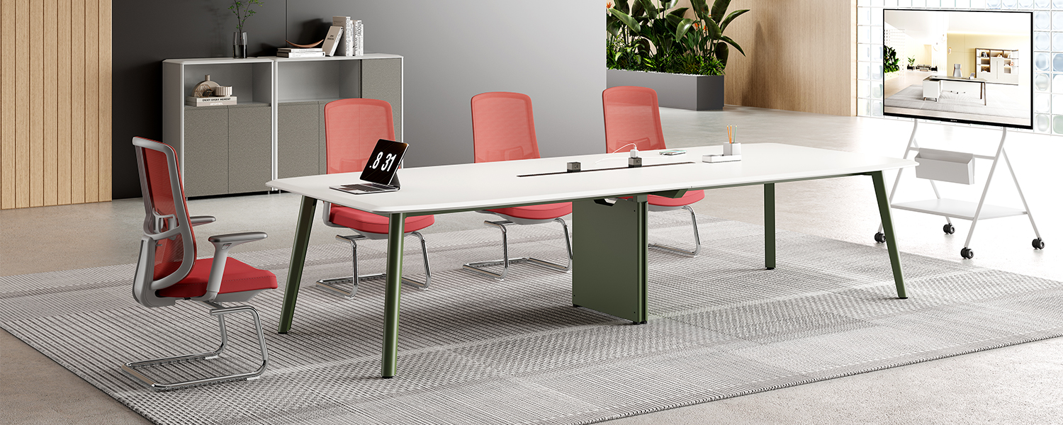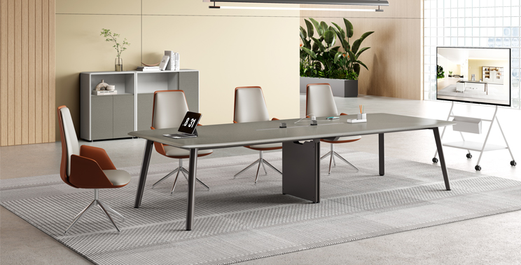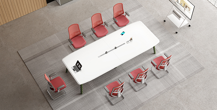 The tabletop continues the series' signature design elements, complementing the executive desk. It features smart power rails with built-in outlets, including multi-function sockets and USB ports, to accommodate various electronic devices.