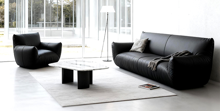 Frame: Solid pine wood combined with plywood inner frame; Filling: “Dongya” sponge from Shengnuomeng Gujia, high-resilience PP cotton, premium down for superior comfort; Covering: Black top-grain cowhide leather, soft and skin-friendly texture; premium PU eco-leather with high abrasion resistance, tear strength, and tensile strengt