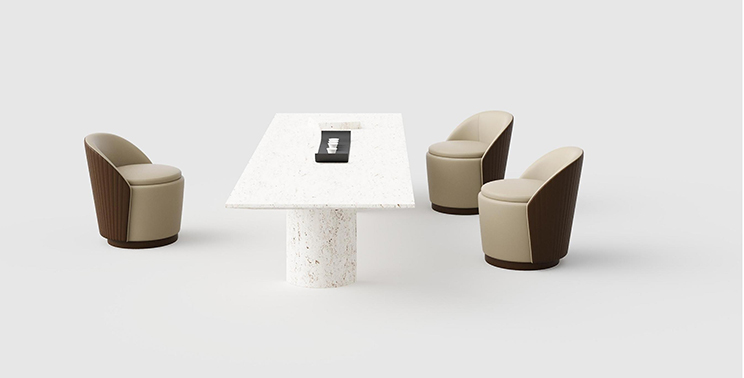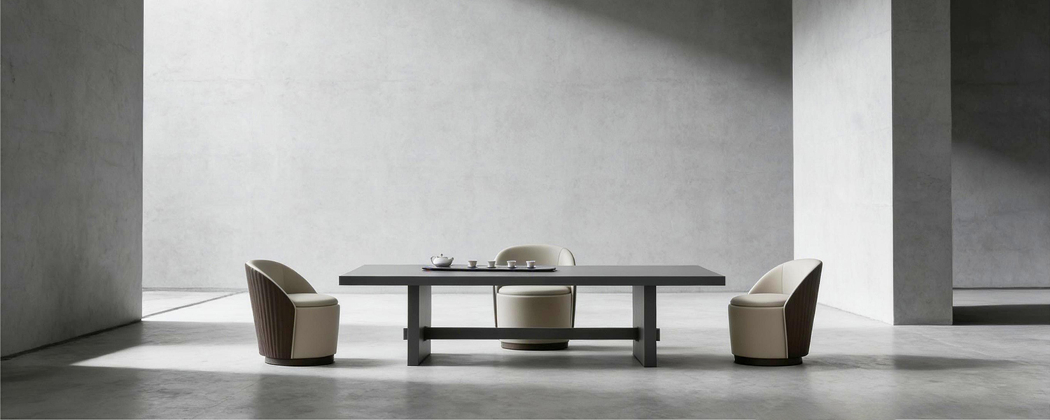 This tea lounge chair embodies a minimalist, Zen-inspired design that captures the quietude and restraint of Eastern aesthetics. Its form—