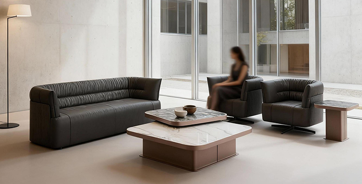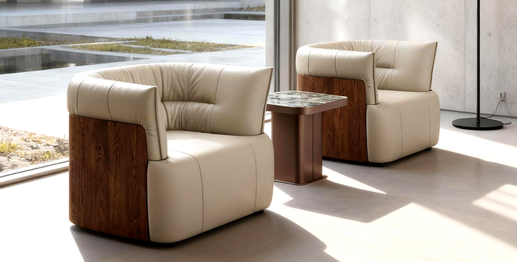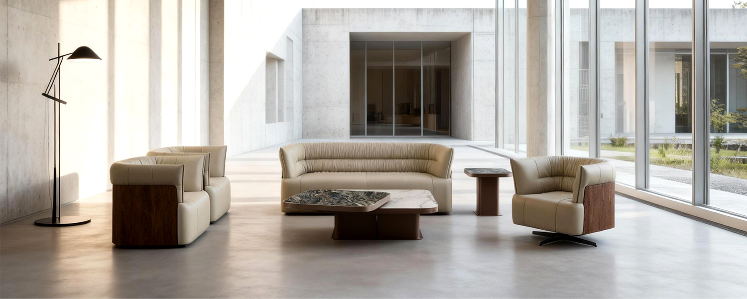 The serene Collection embodies wabi-sabi aesthetics, redefining serene luxury. Full-grain leather sofas and swivel armchairs feature warm solid wood frames with sculptural lines, while refined stitching creates flowing light-and- shadow textures. A three-layer high-density foam cushion system, paired with a floating solid wood base and concealed metal supports, preserves the material's natural breathability while achieving visual weightlessness—harmonizing aesthetic elegance with functional precision.